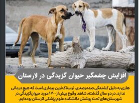 ✳ آمارها حاکی از افزایش چشمگیر حیوان گزیدگی در لارستان است/ هاری به دلیل کشندگی صددرصدی، ترسناکترین بیماری است که هیچ درمانی ندارد/شهروندان از غذا دادن به سگهای ولگرد در معابر خودداری کنند، چون باعث جذب و تجمع بیشتر آنها میشود/ اقدامات کنترلی شهرداریها ناقص و ناکافی بوده است